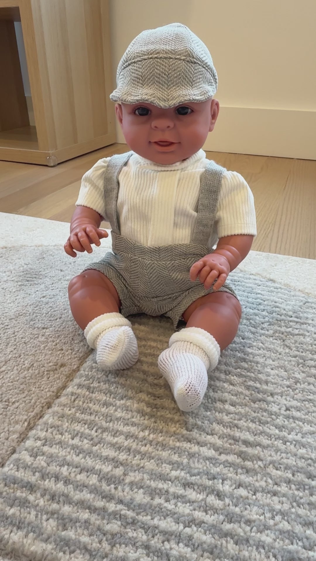 • White ribbed tee, grey herringbone overalls, textured cap, white socks
