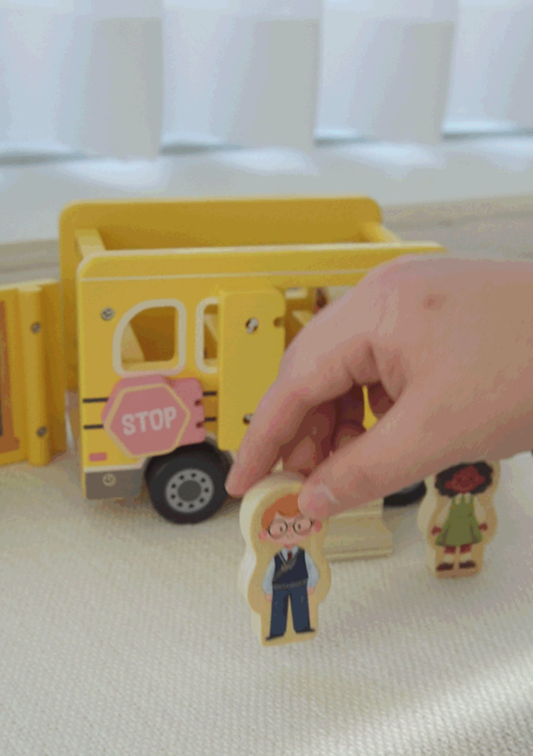 - 7-piece complete playset β 1 wooden school bus, 5 diverse character figures (bus driver + 4 students), and 1 wooden step piece for boarding