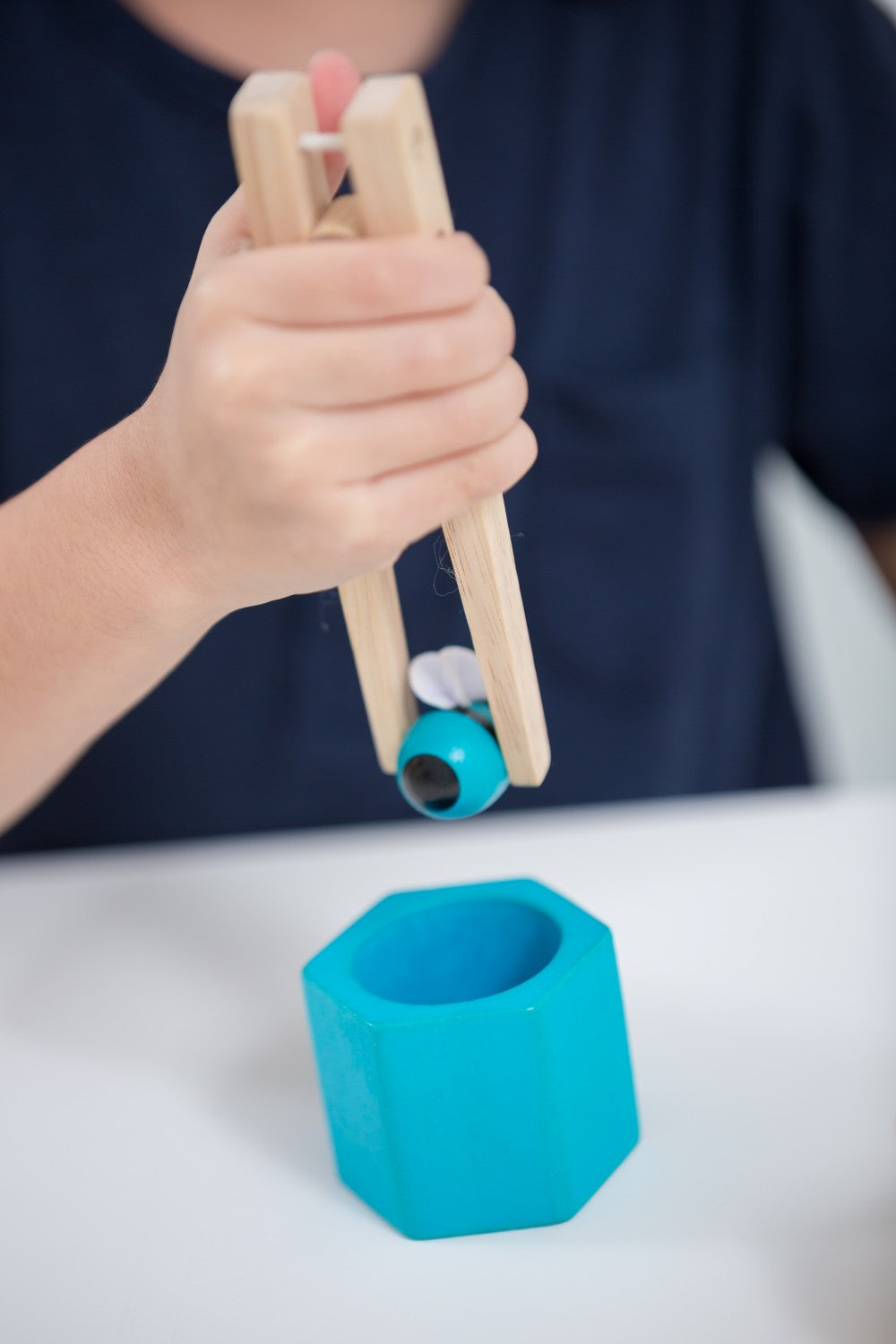 ✓ Using tongs to grasp and place bees develops pincer grip essential for writing
