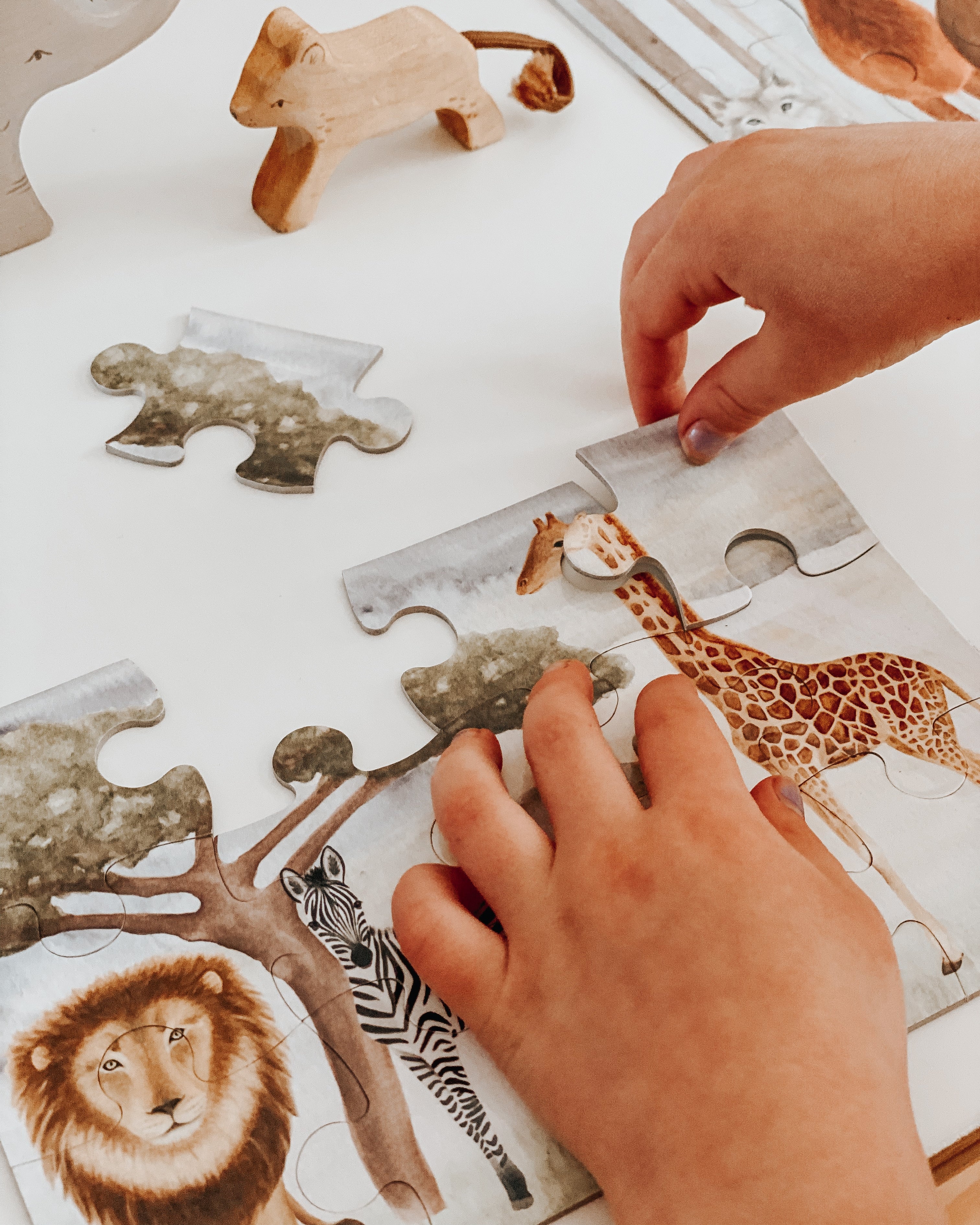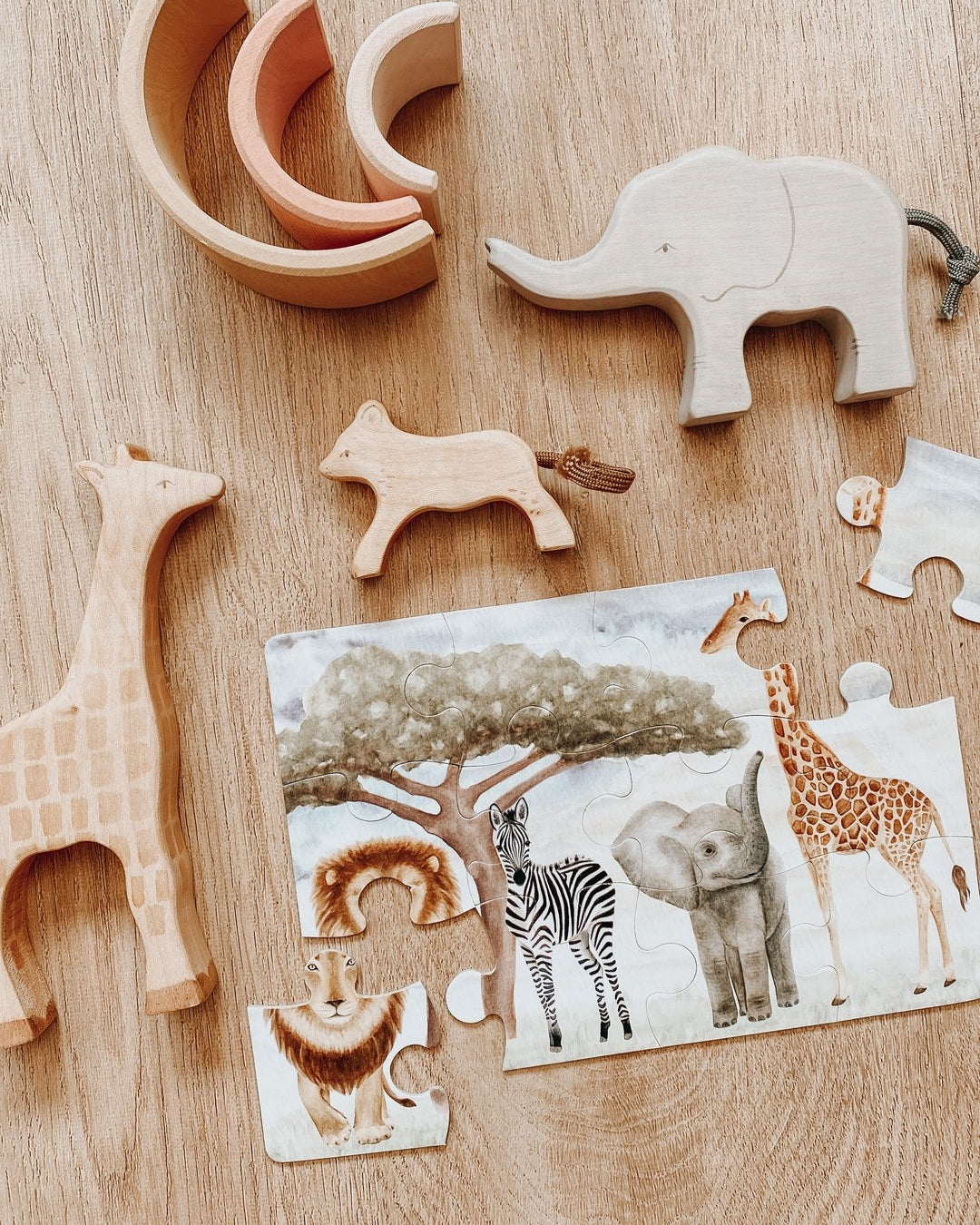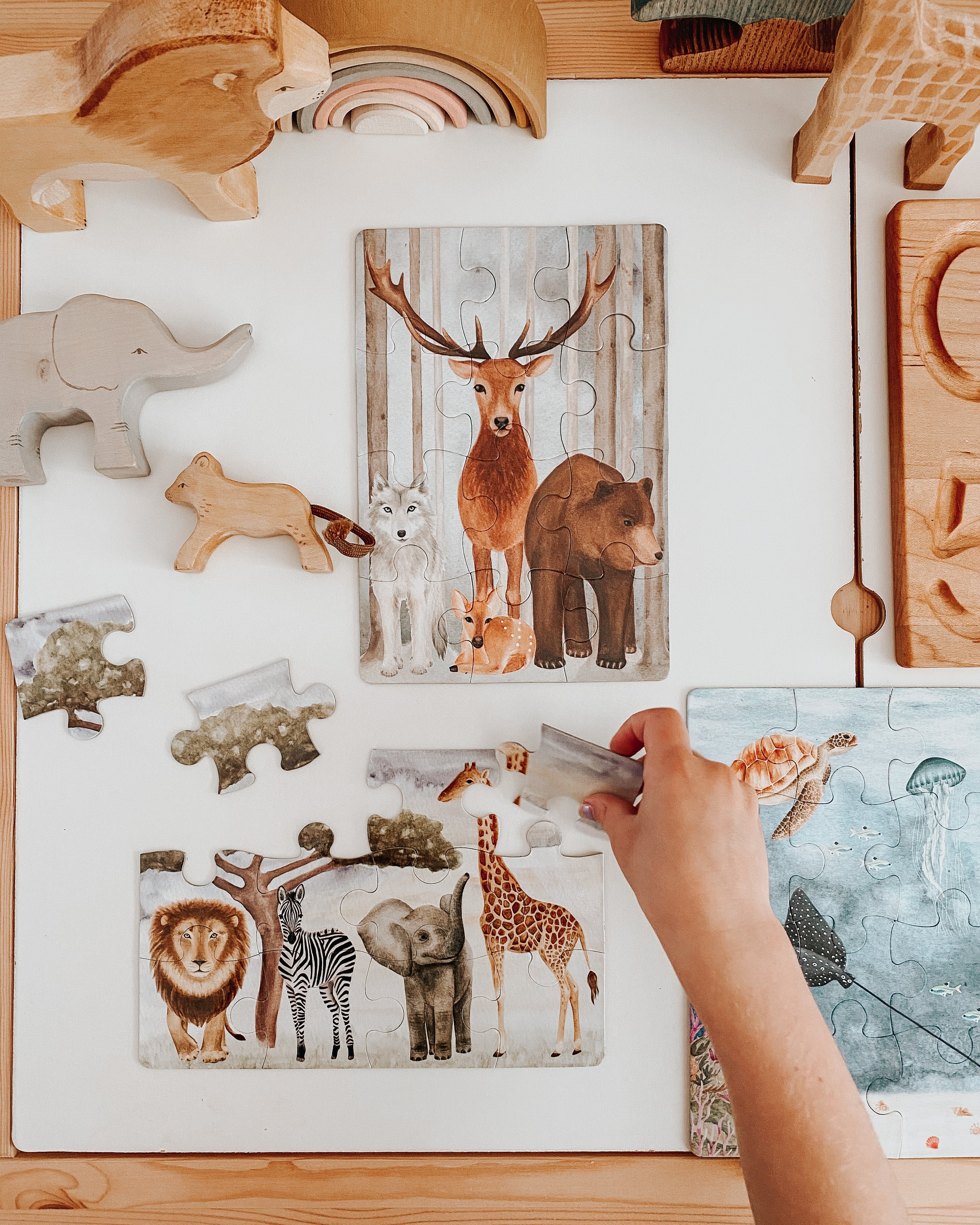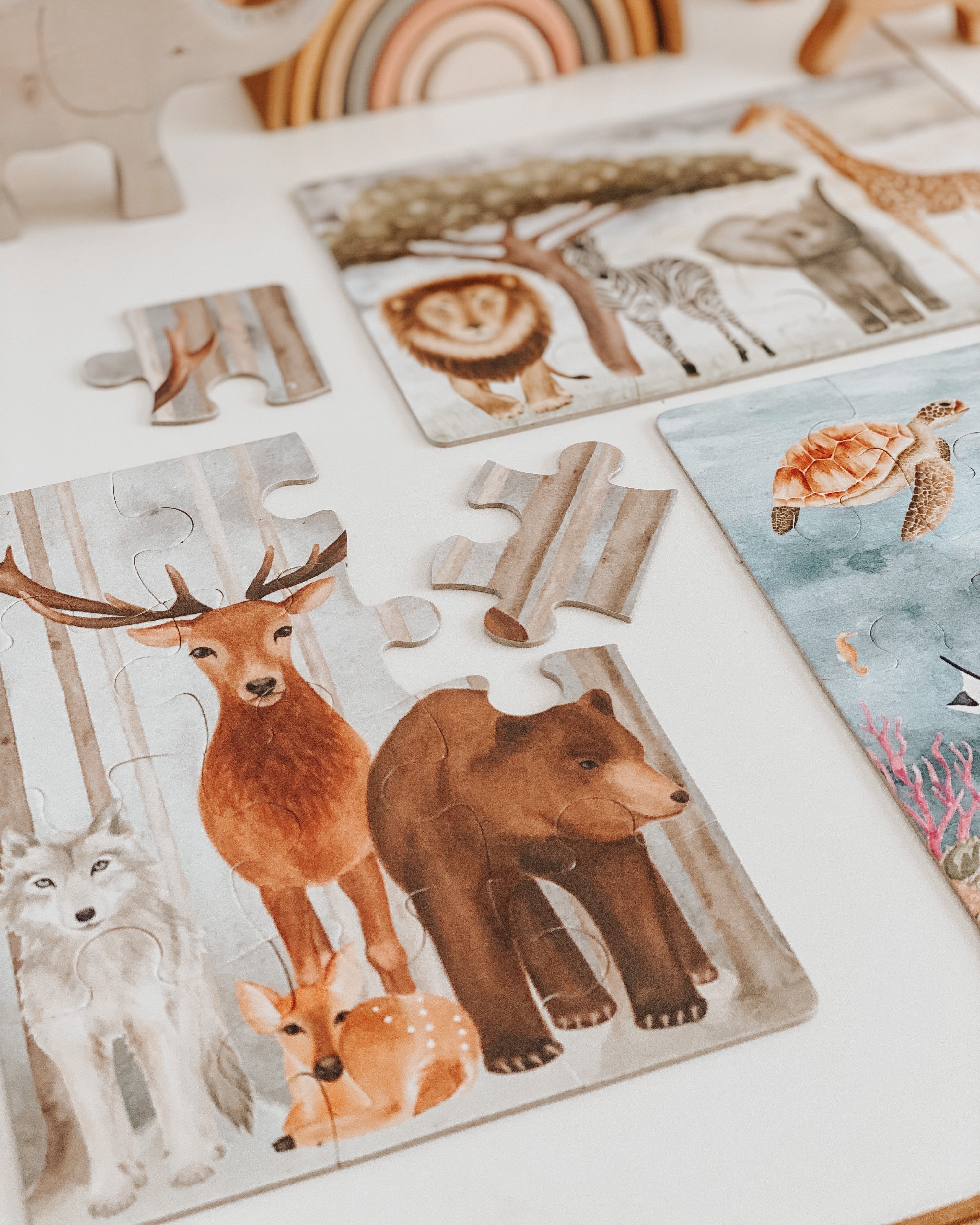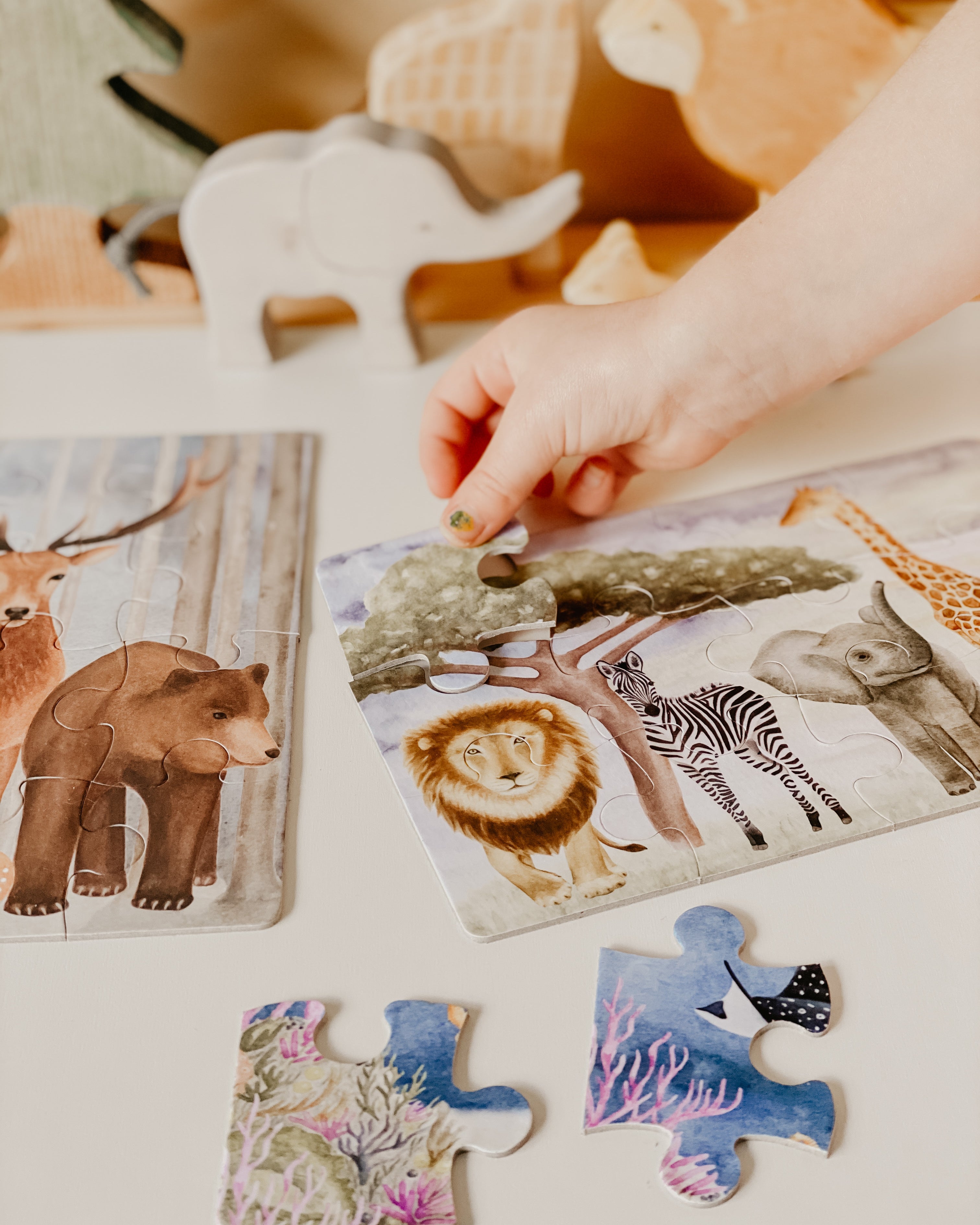 This trio of beautiful 12-piece jigsaw puzzles features some of your favorite majestic creatures from all around the world. Venture on a safari, dive into the ocean and take a stroll through the enchanted forest. Teach your little one to learn through play and develop motor skills, hand-eye coordination, problem solving and shape recognition.