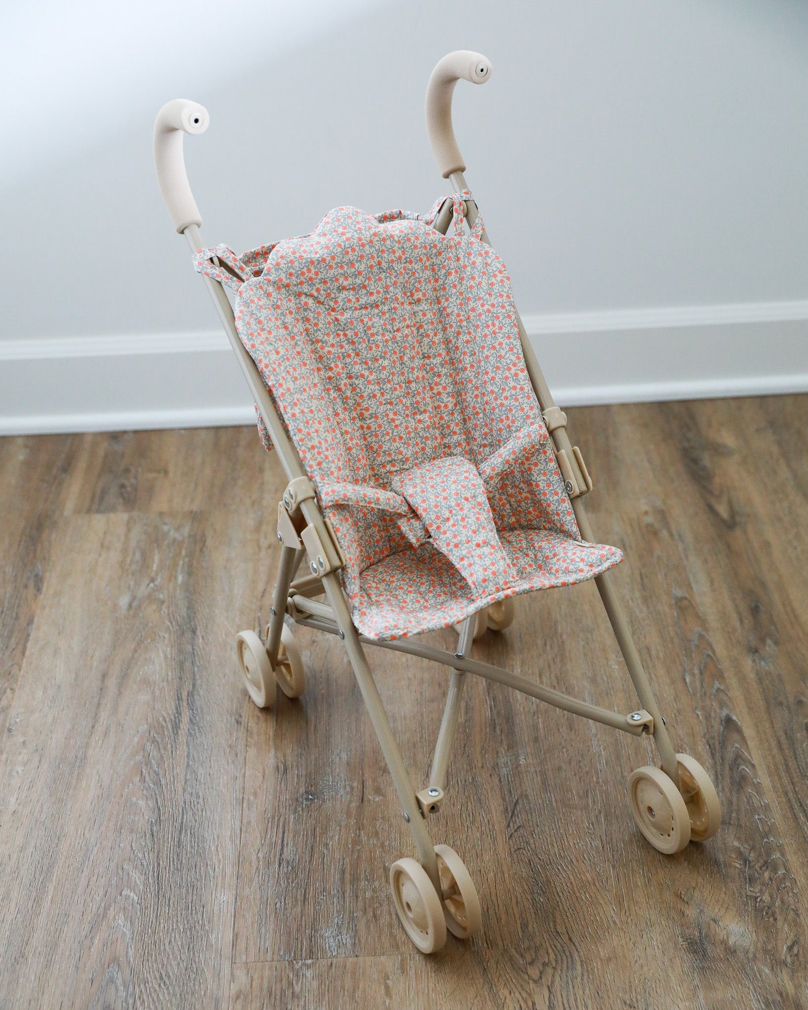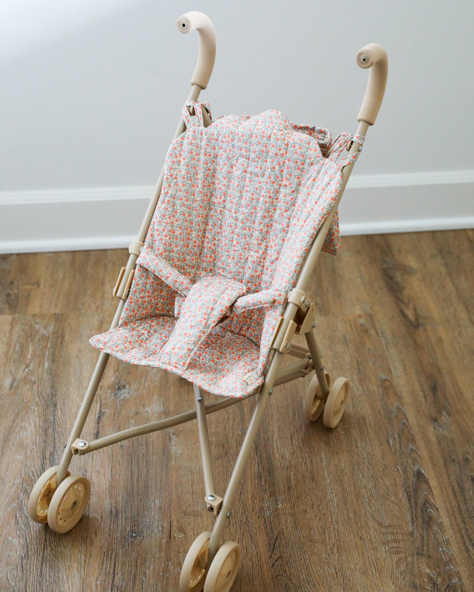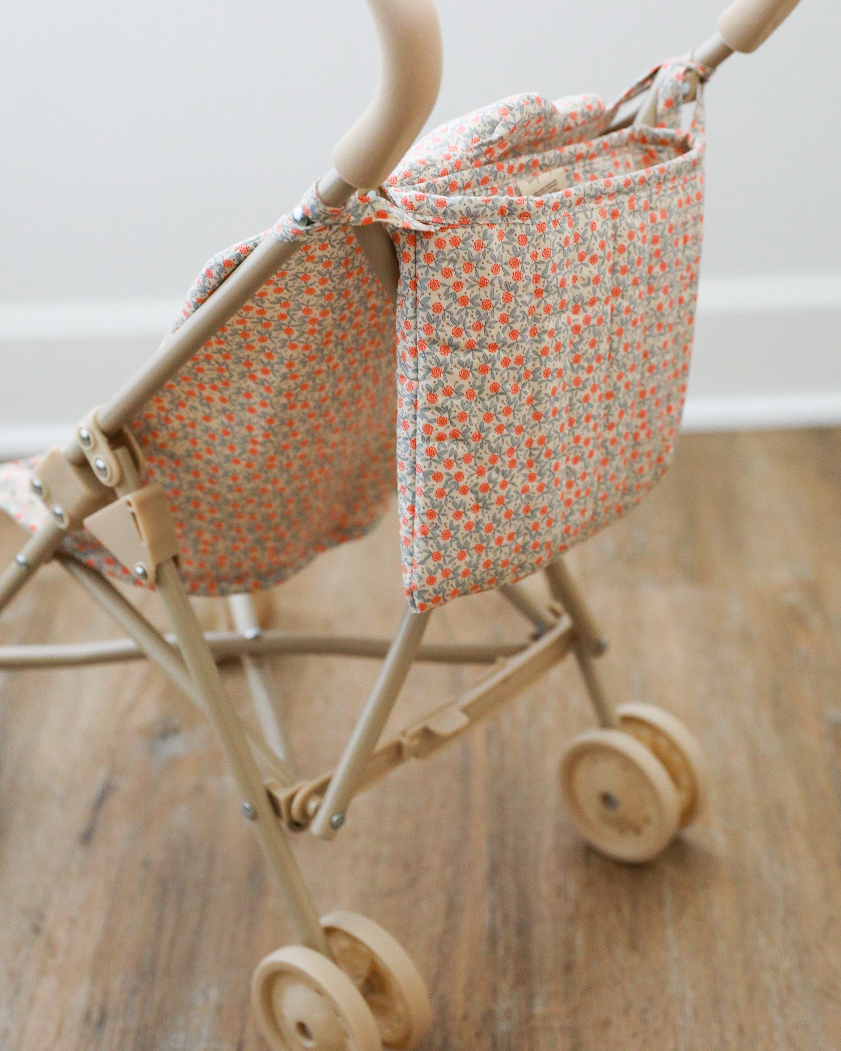 Take your adorable doll everywhere in the cutest baby doll stroller! This amazing doll stroller in a beautiful Fleur De Glace print features removable fabric made of 100% organic cotton. The frame is made of reinforced iron with soft and spongy EVA material at the handles.
