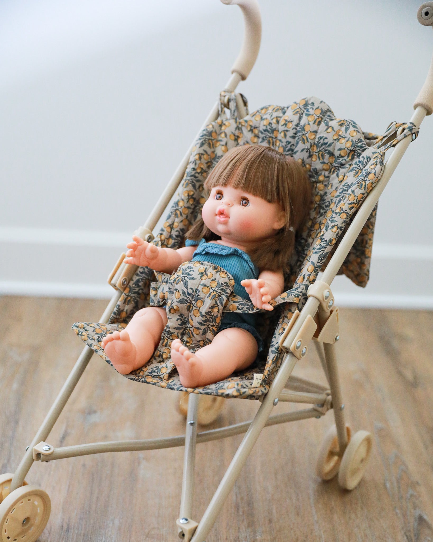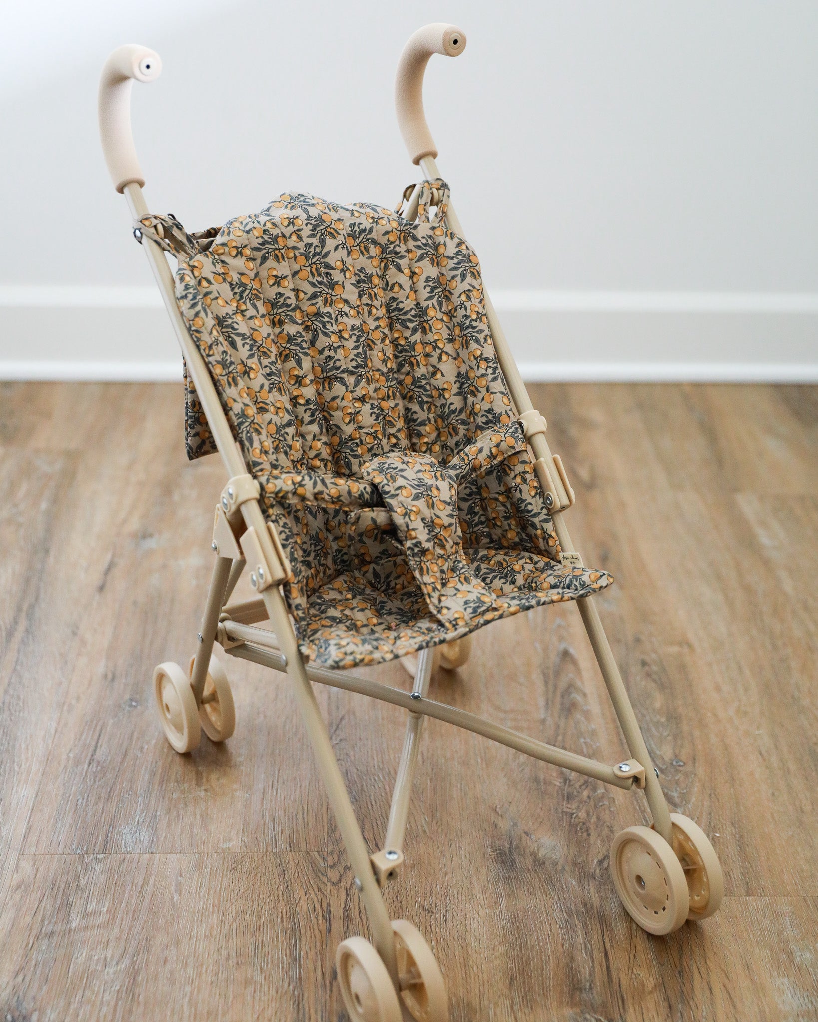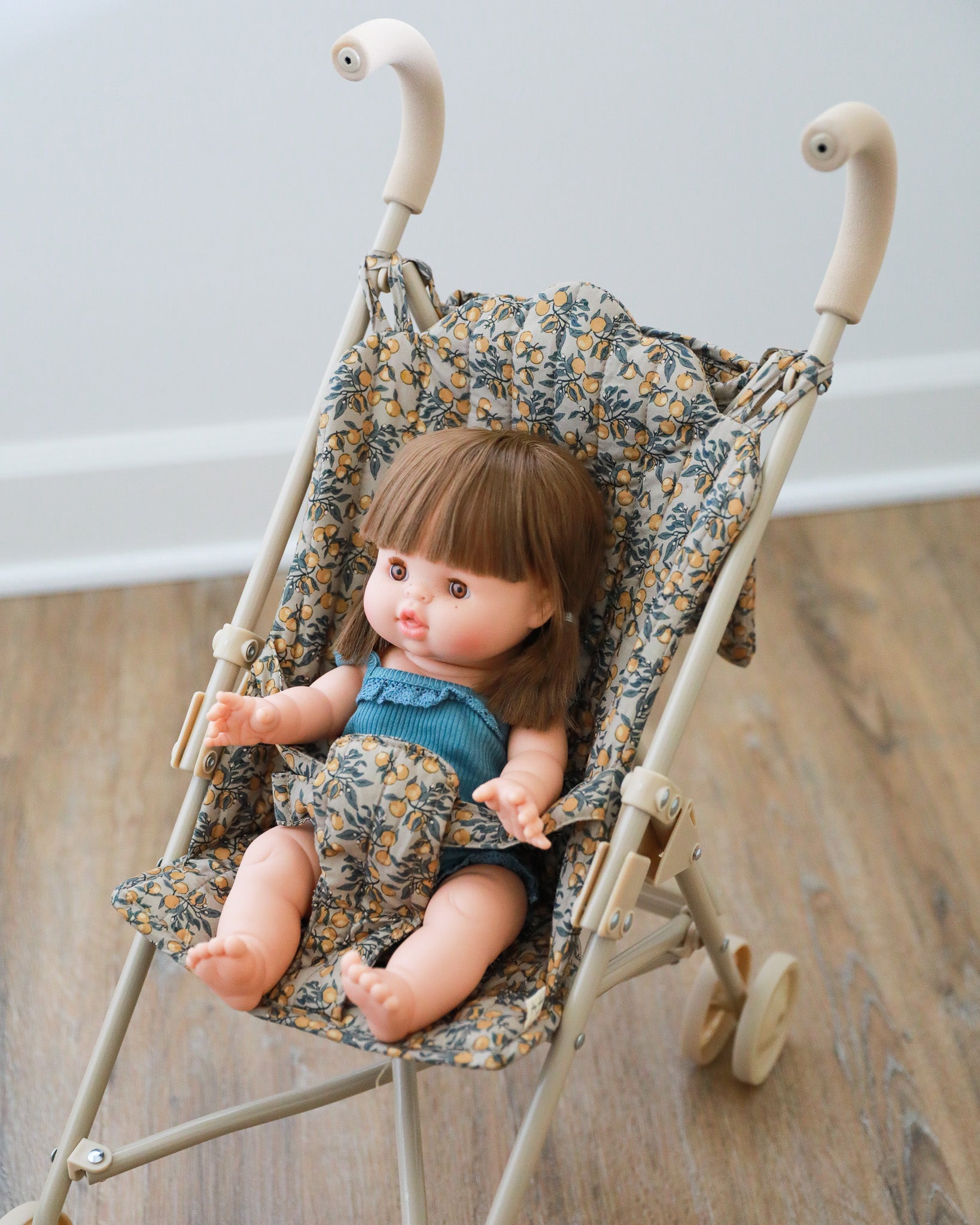 Take your adorable doll everywhere in the cutest baby doll stroller! This amazing doll stroller in a beautiful Orangerie Beige print features removable fabric made of 100% organic cotton. The frame is made of reinforced iron with soft and spongy EVA material at the handles.