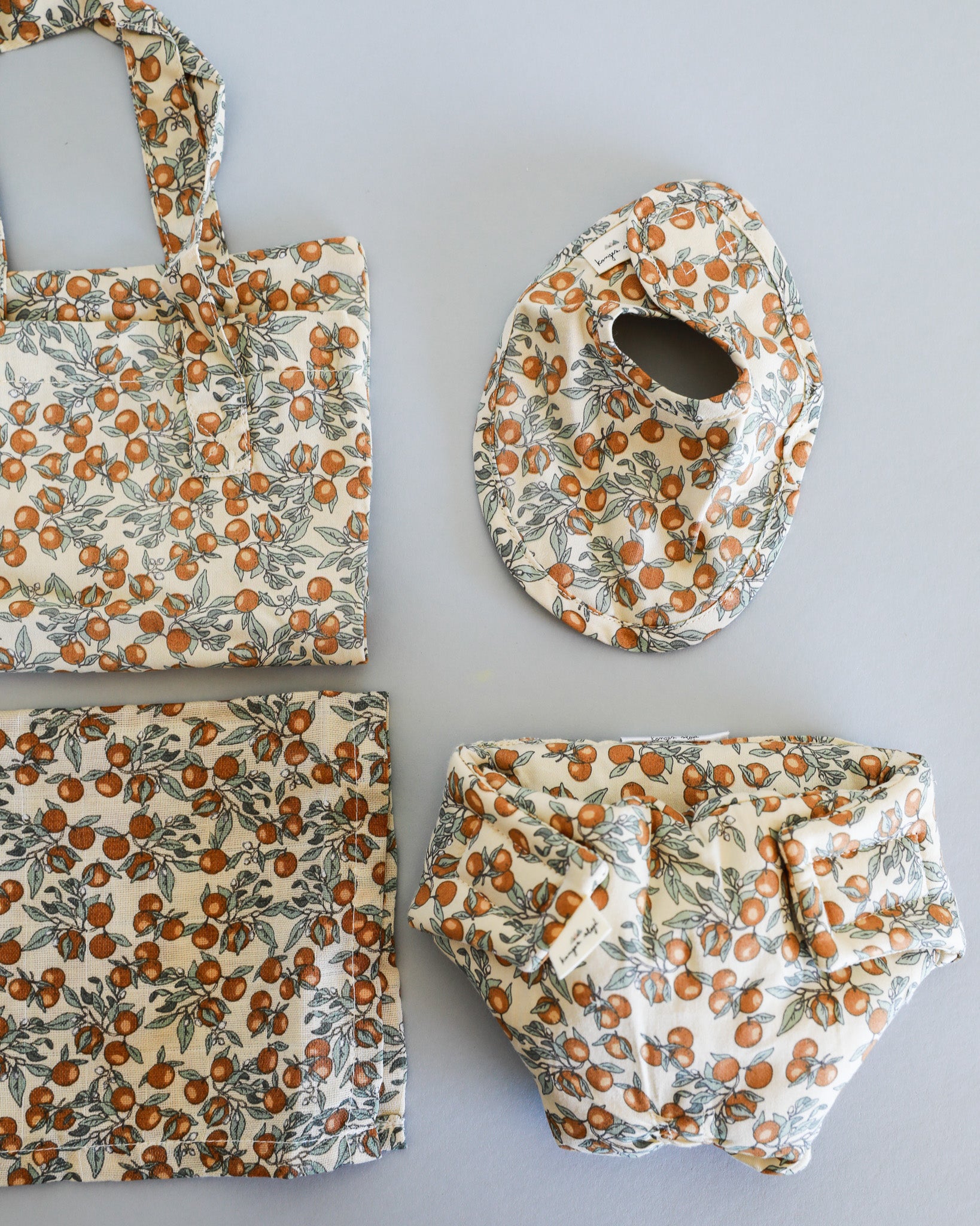 This gorgeous Doll Nursery Set comes in Orangerie Beige print matching the Orangerie Beige doll stroller, doll table chair, doll pram and doll carrier that we have! The nursery set comes with a doll bib, a cloth diaper with velcro snaps and muslin cloth for the doll made in 100% organic cotton! And don't forget the gorgeous tote bag to store the nursery set in!