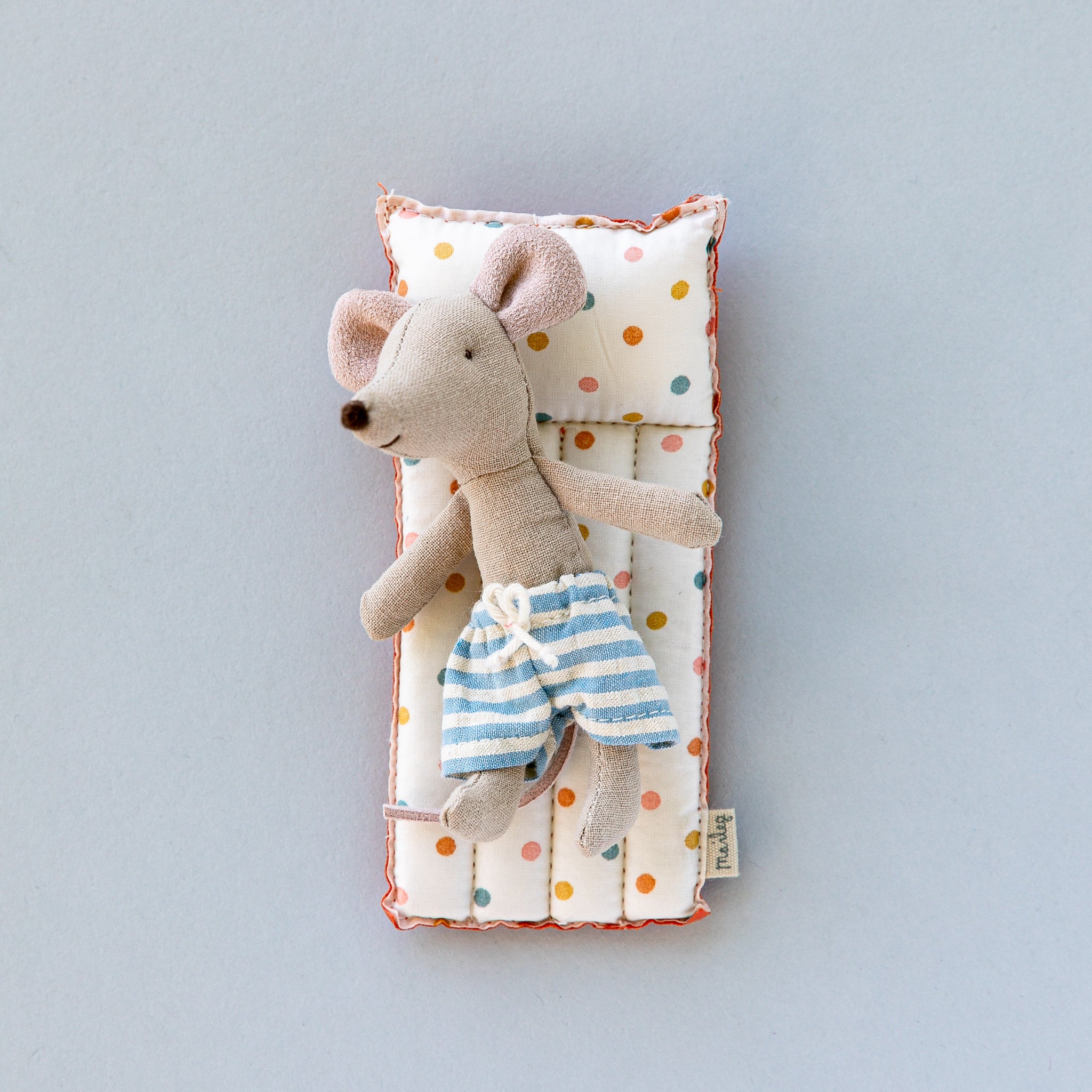Vacation time! Maileg air mattress made in coated fabric for an authentic look. It is not waterproof, so only play on dry ground… only in your imagination, it can float on water. This set fits all micro mice sizes.