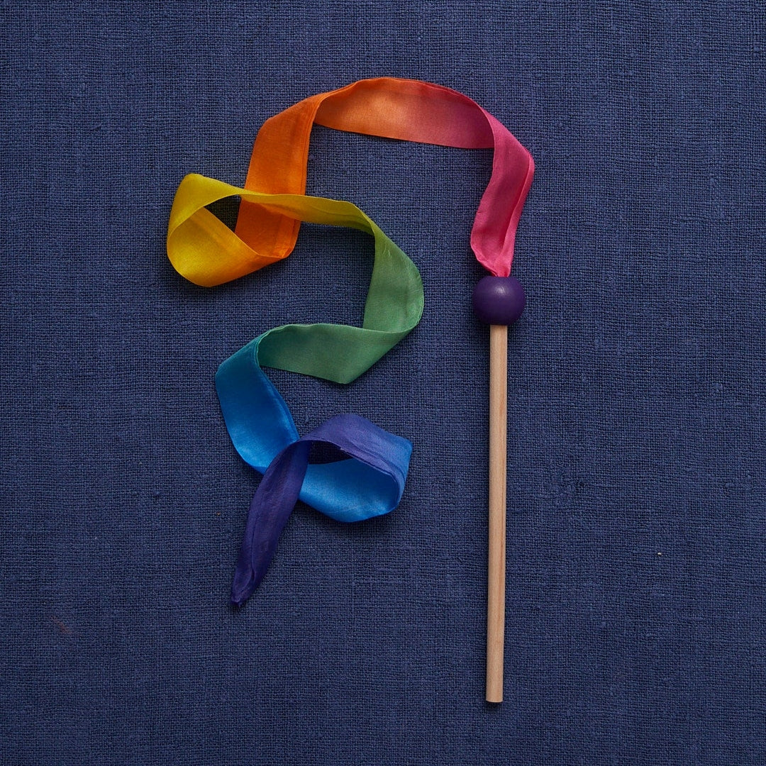 A birch wood wand with a shimmering silk streamer, topped with a decorative wooden bead, star or heart.